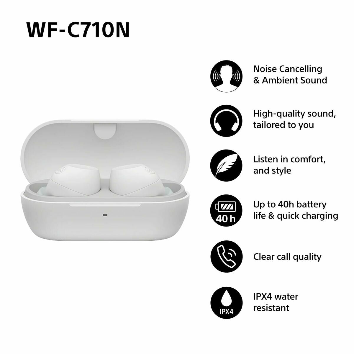 Les écouteurs Sony WFC710NW TW en couleur blanc sont des dispositifs intra-auriculaires conçus pour offrir une expérience sonore claire et immersive, intégrant des technologies avancées telles que la réduction active du bruit, qui minimise les distractions extérieures pour un son plus pur et concentré. Ils disposent d’une connectivité multiple, incluant le Bluetooth pour une connexion sans fil stable et polyvalente, ainsi que des options de connexion filaire compatibles avec USB, USB-C et prise jack 3,5 mm, facilitant leur utilisation sur différents appareils et situations. Fabriqués avec des matériaux résistants à l’eau, ils offrent durabilité et protection contre les éclaboussures ou la transpiration, idéaux pour un usage quotidien ou lors d’activités sportives et déplacements. Leur design compact et léger en plastique blanc assure un confort même après de longues périodes d’utilisation, tandis que le microphone intégré garantit une communication claire lors d’appels ou visioconférences. De plus, leur compatibilité avec le Wi-Fi étend leurs possibilités de connexion, favorisant une expérience sans fil plus complète. En somme, ces écouteurs allient polyvalence de connectivité et fonctionnalité, mettant l’accent sur la qualité sonore et le confort utilisateur. Ce modèle reflète l’engagement de Sony à offrir un équilibre solide entre technologie avancée et praticité dans ses accessoires audio.